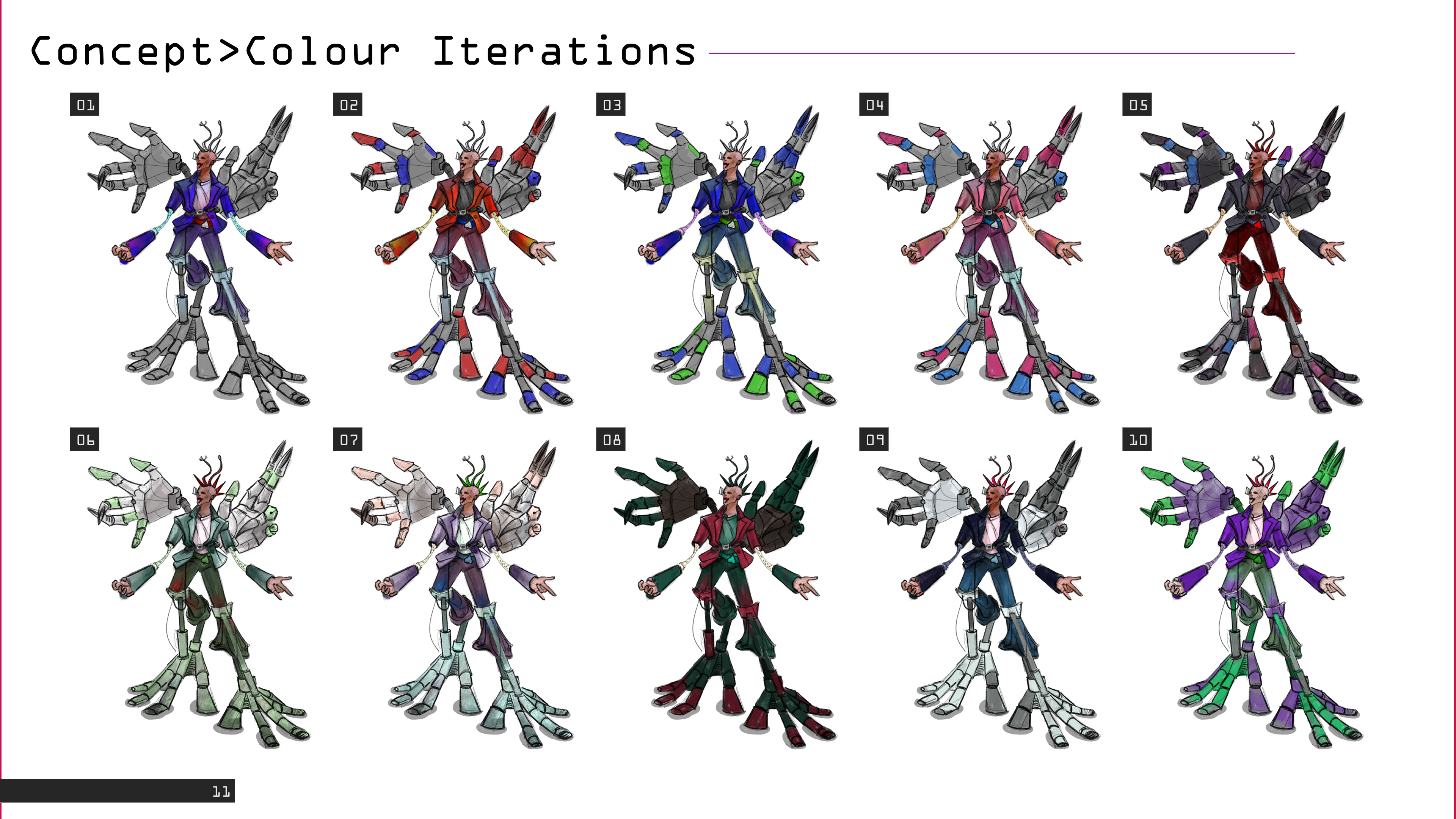 With colour iterations I tried to use different combos to illicit different feelings. The neons give party or rave culture; the pastels give eco-warrior or hero type; the bright colours give pop star and the darks give villain.