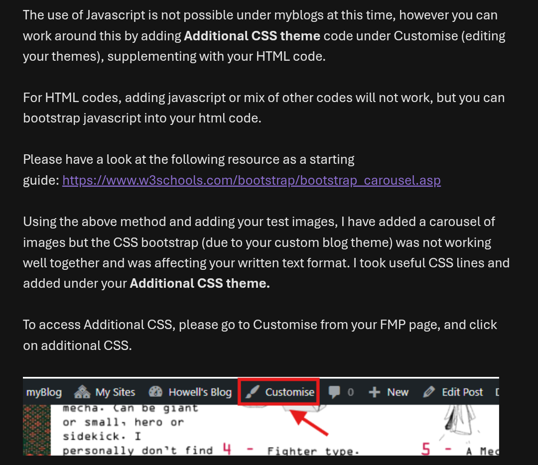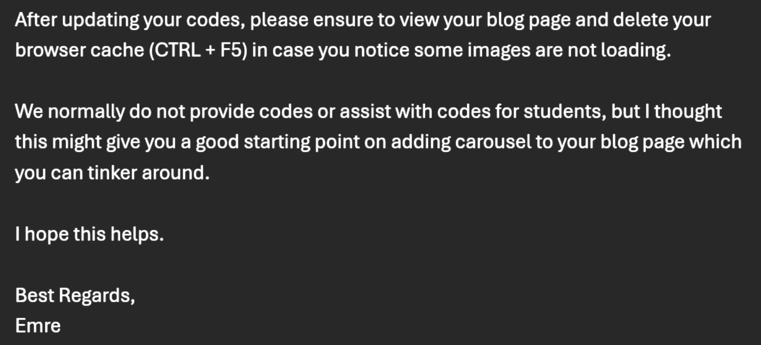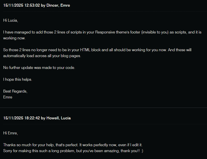 My issues right off the bat were that JavaScript does not run on MyBlog. Deeply saddening. With hope in my heart, I asked the people at MySupport to see if there was a was to get the JS running. Unfortunately not. Dear Emre, the agent who honestly went so above and beyond for me (thank you!!), tried a way to get it to run without the JS, instead using the HTML <script> tags.