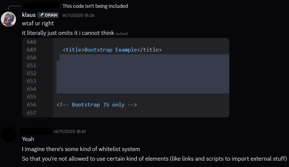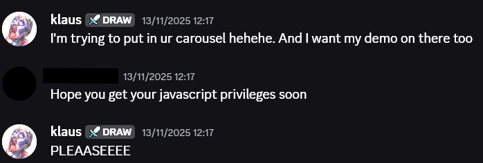 What I didn’t realise until later, but because Emre is an admin, they can run javascript without problem, but my peasant status means that I cannot.