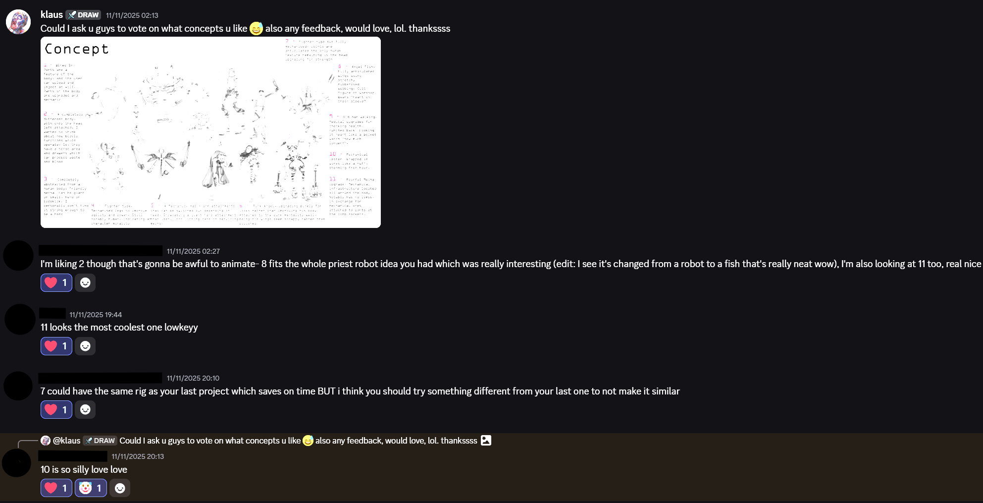 I put my concepts to a vote in the class discord to get views and feedback, as well as a general vote. I got some nice opinions and a good idea of the general concensus. Apologies you cant see the concepts here, but scroll up and you can see them again.